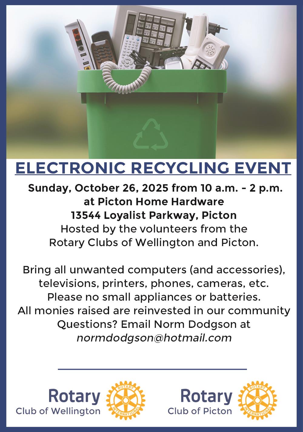 The Rotary Club of Wellington, along with the Rotary Club of Picton, will be holding an electronic recylcling event on Sunday October 26, 2025 from 10AM to 2 PM at Picton Home Hardware. Bring any unwanted computers (and accessories), TVs, printers, phones, cameras, etc. Please no small appliances or batteries. All monies raised are reinvested in our community.